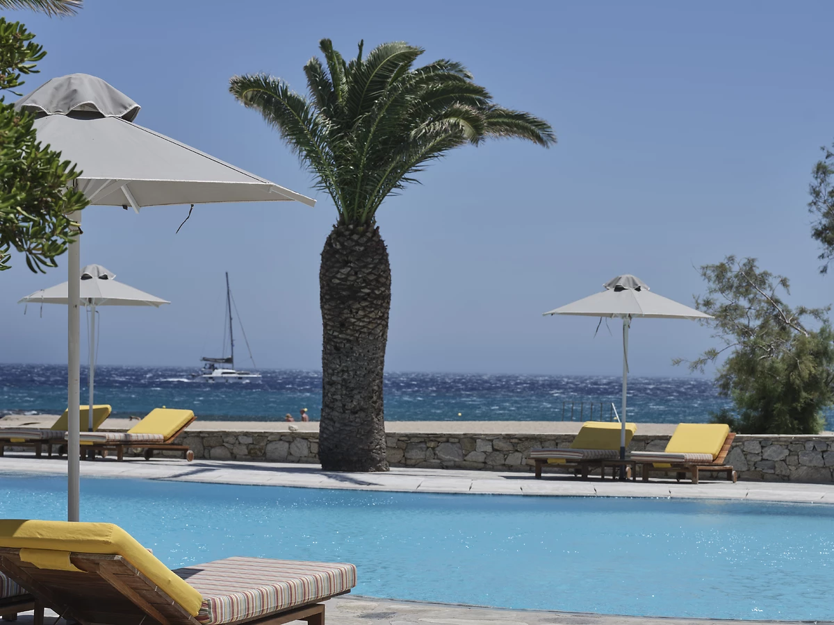 Les chambres et suites du Sunrise Mykonos Beach Hotel incarnent l'essence de la vie insulaire traditionnelle, avec une architecture cycladique blanchie à la chaux et ponctué de charmants volets en bois. Chaque hébergement est conçu pour vous connecter aux éléments naturels environnants — la mer, le sable, les rochers, le bois et la terre — créant ainsi une atmosphère apaisante et authentique. Les chambres situées à l'étage supérieur disposent de balcons privés meublés offrant des vues panoramiques, tandis que celles du rez-de-chaussée s'ouvrent sur des terrasses aménagées, certaines équipées d'un jacuzzi ou d'une piscine privée.
