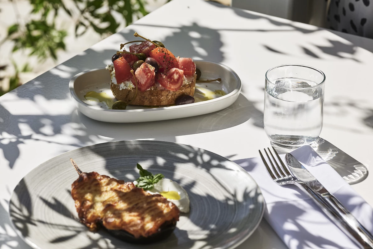 Après une baignade matinale dans les eaux cristallines d'Agrari, laissez-vous tenter par le petit-déjeuner buffet généreux de l'hôtel. Pains au levain fraîchement cuits, koulouris traditionnels, viennoiseries croustillantes, fromages locaux, charcuteries, confitures maison et œufs préparés à la demande composent ce festin matinal.