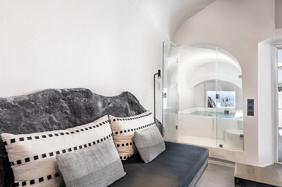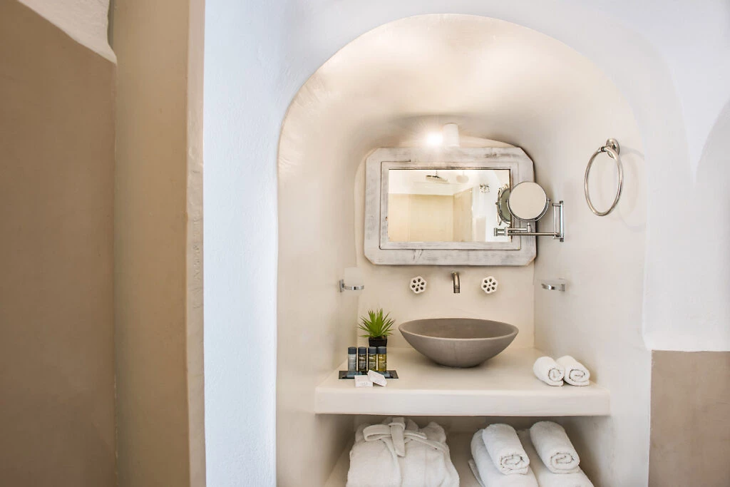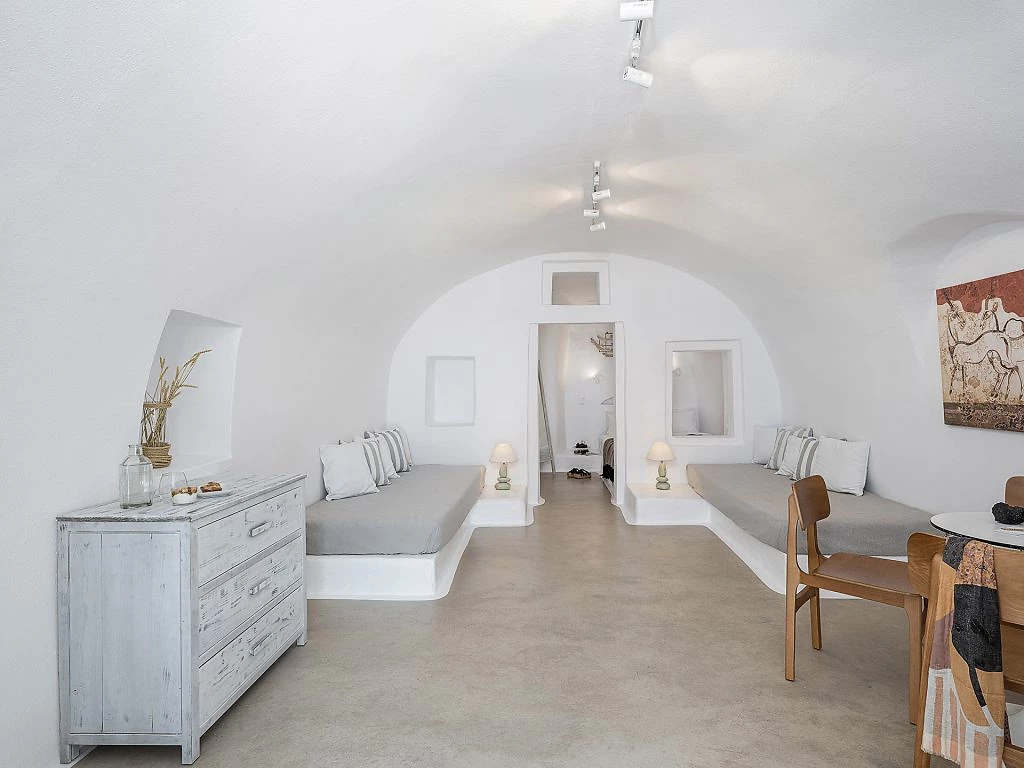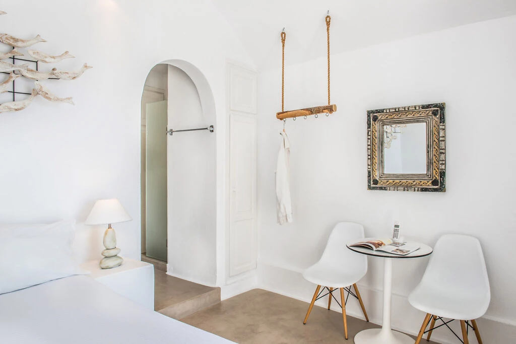 Toutes les chambres, décorées avec luxe, climatisées et avec vue sur la caldeira, se composent d'une chambre à coucher et d'une élégante salle de bains avec douche. Les terrasses confortables offrent une vue incomparable sur le vaste bleu de la mer Égée et la caldeira divine.