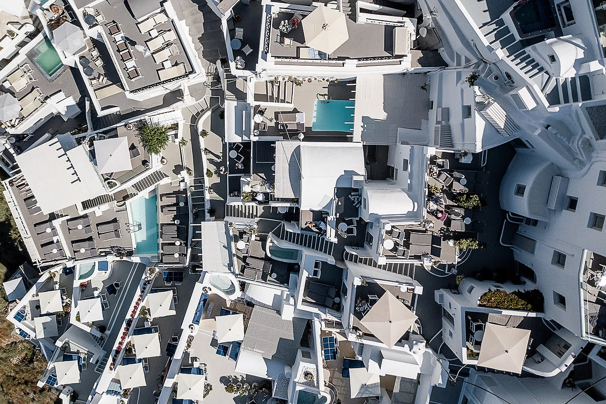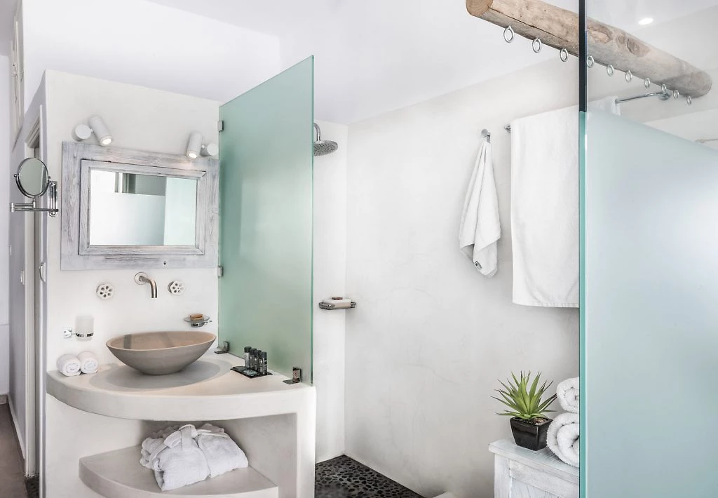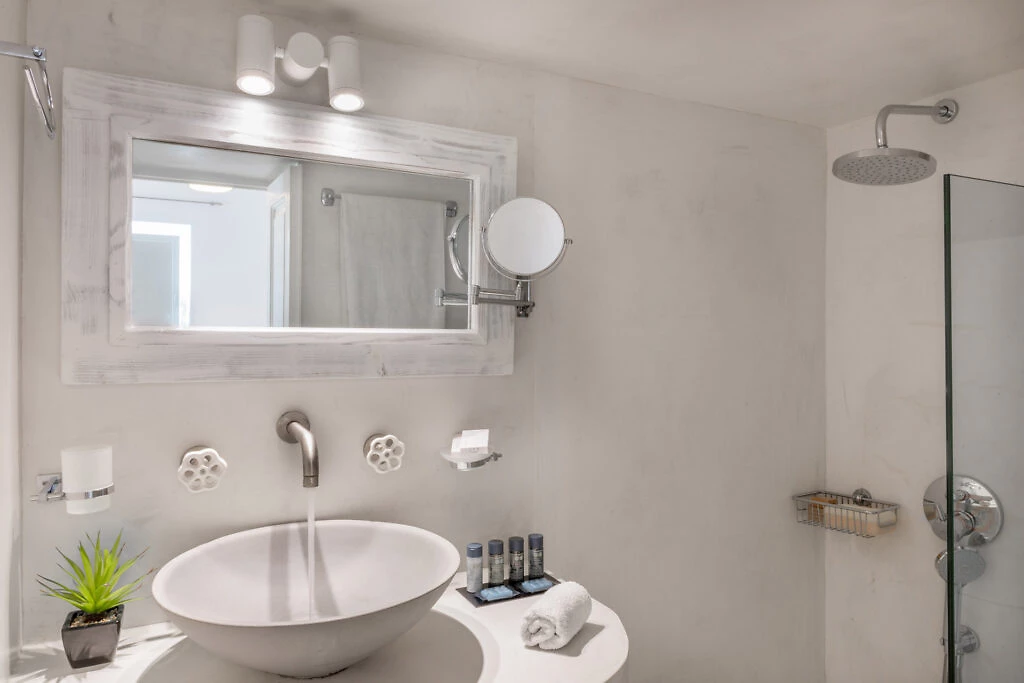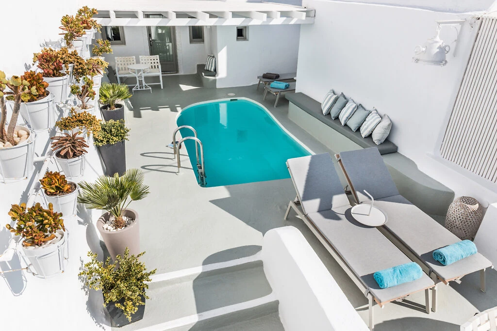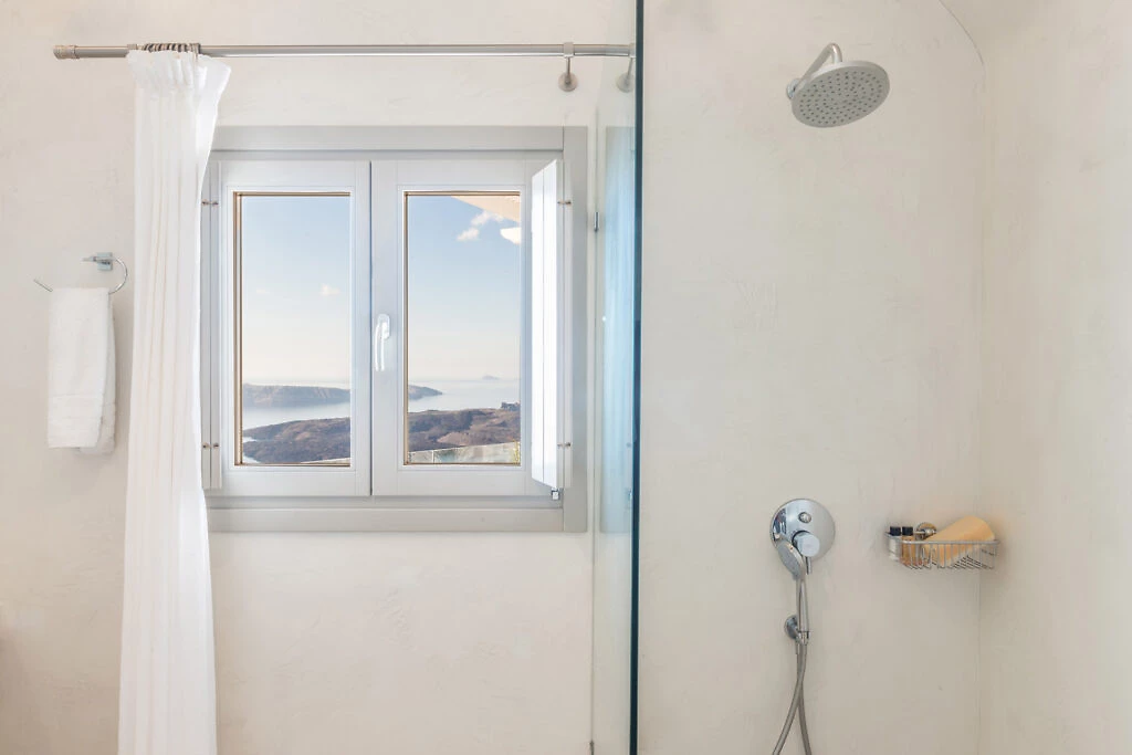 Toutes les chambres, décorées avec luxe, climatisées et avec vue sur la caldeira, se composent d'une chambre à coucher et d'une élégante salle de bains avec douche. Les terrasses confortables offrent une vue incomparable sur le vaste bleu de la mer Égée et la caldeira divine.