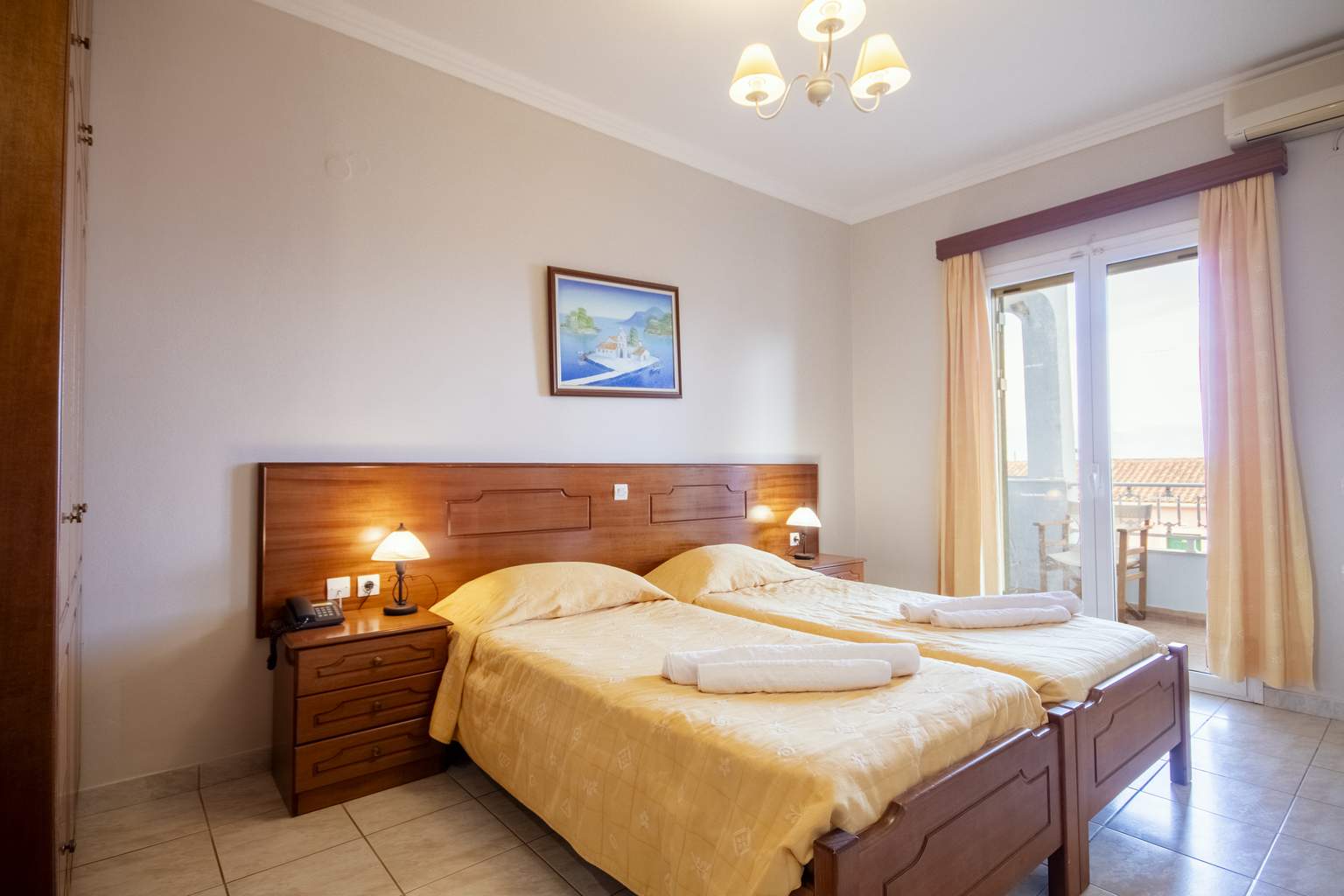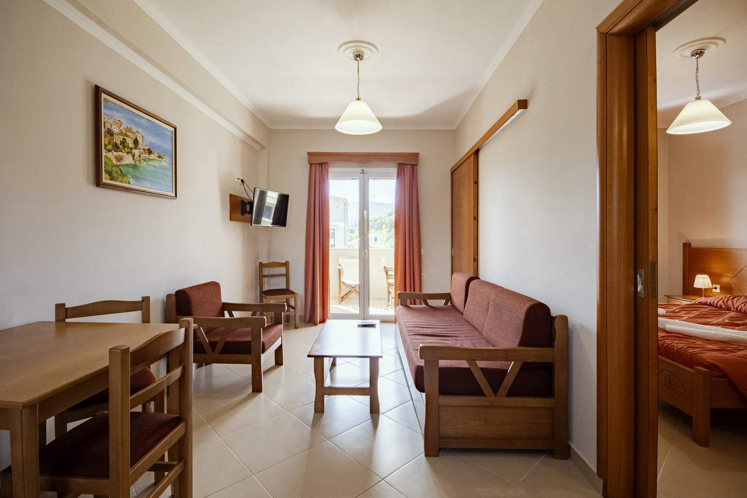 Les Appartements Standard offrent un espace de 45 m² pensé pour les familles, avec une atmosphère lumineuse et un agencement confortable. La chambre et le coin salon, séparés par des portes coulissantes, permettent de profiter de moments d'intimité, tandis que le balcon aménagé invite à se détendre face à la vue jardin ou mer.