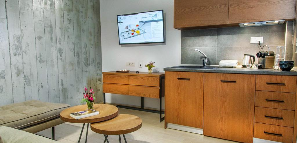 Kitchenette équipée de : réfrigérateur, ustensiles de cuisine, cafetière, bouilloire