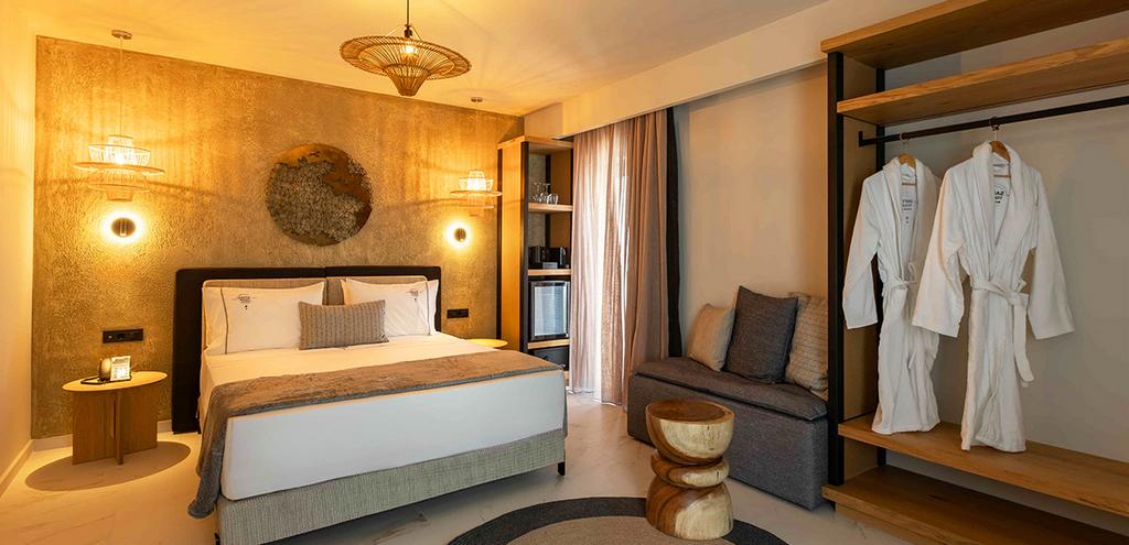 Le Santo Mångata Boutique Hotel 5* Adult Only + 17 dispose de 24 chambres conçues pour offrir une atmosphère calme avec un décor minimaliste, inspirées du patrimoine Santorin et décorées aux couleurs locales de l'île, créant un lien privilégié entre les formes contemporaines et le style traditionnel.