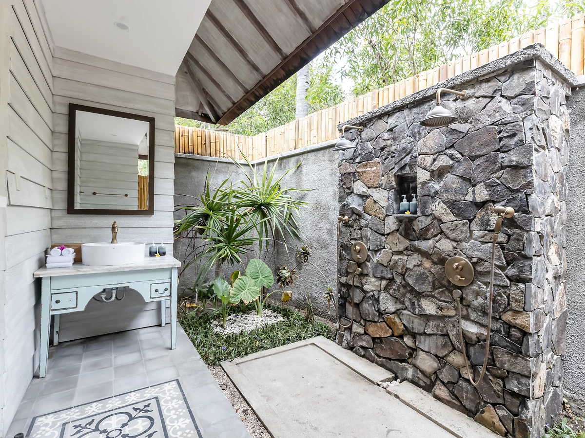 • Suite piscine : Suite de 50 m2 pour 3 personnes avec salle de bains extérieure et accès direct à la piscine principale.