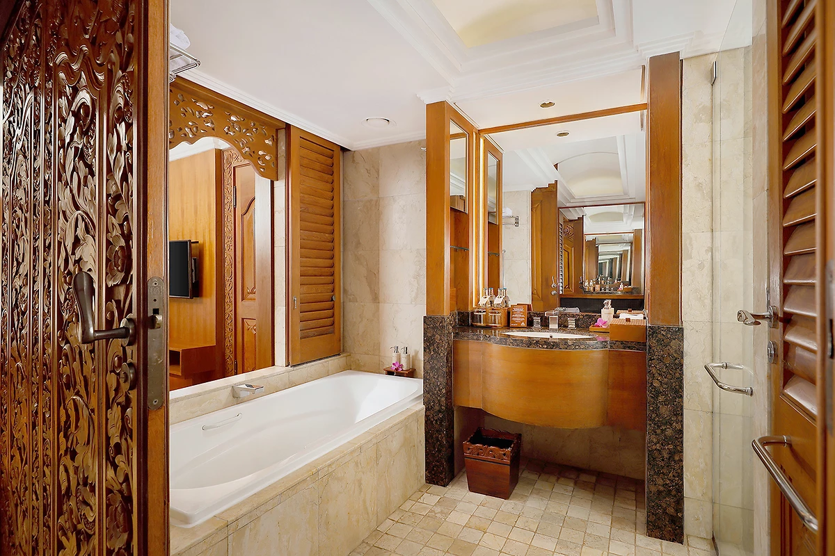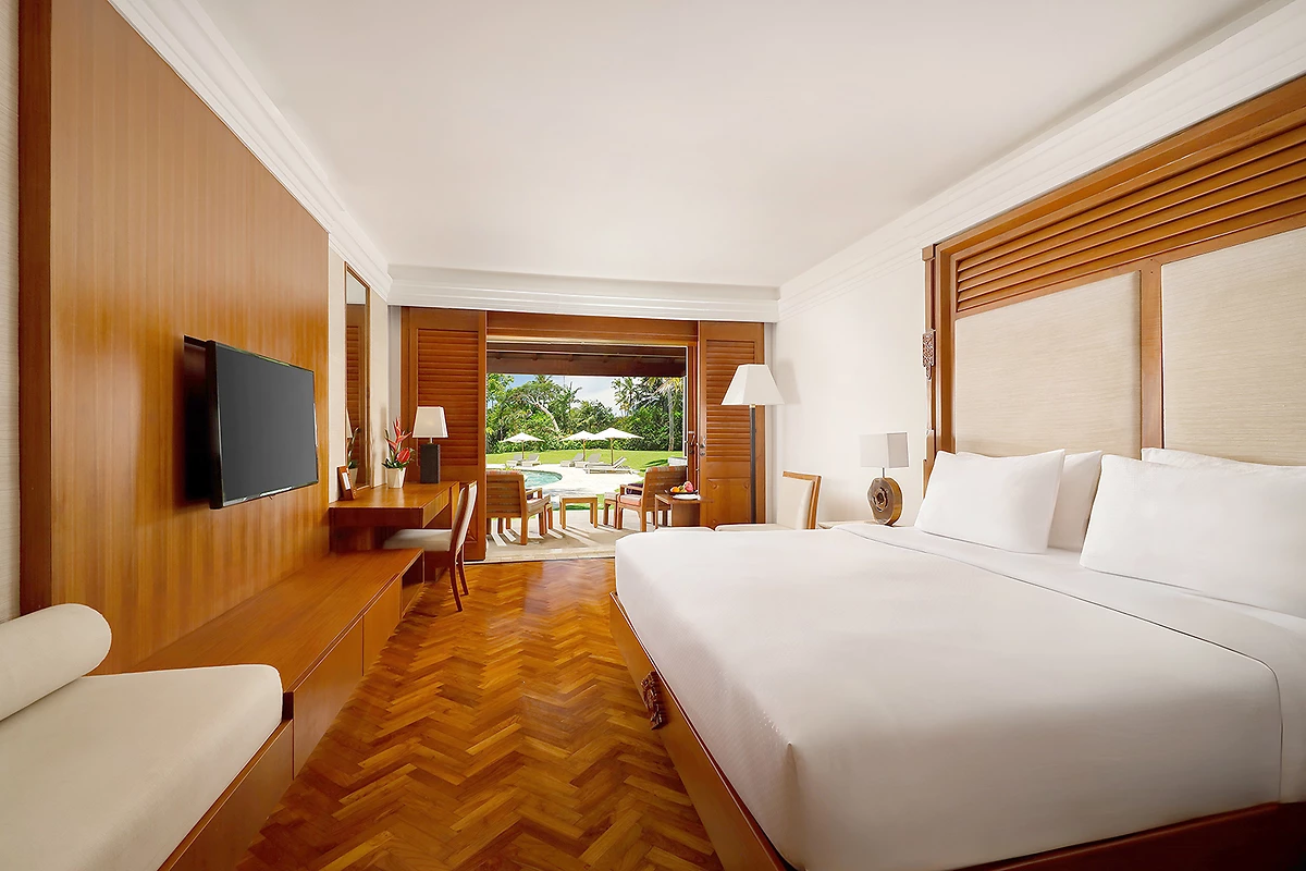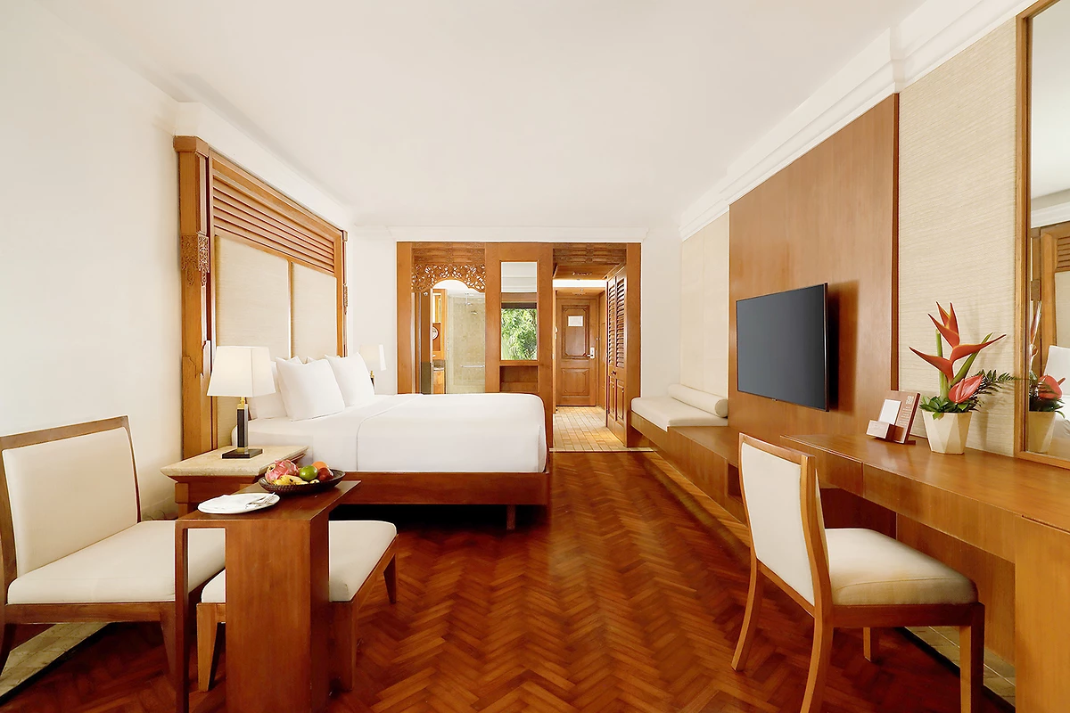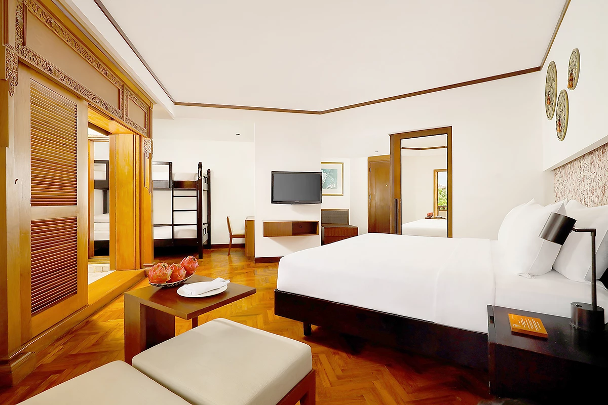 Le resort compte 381 chambres et suites, toutes décorées dans un style balinais traditionnel avec des meubles en teck et des touches modernes. Chaque chambre offre une vue imprenable sur les jardins, équipée de climatisation, minibar, coffre-fort.
