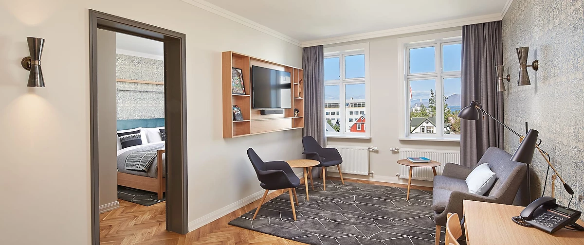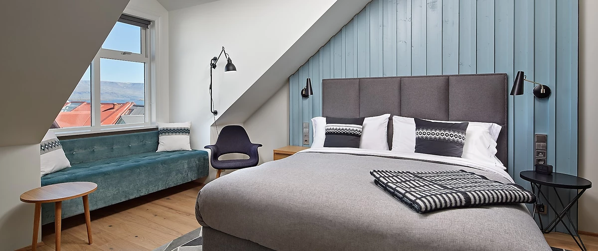 Composé de six bâtiments communiquant les uns avec les autres, l'hôtel Canopy proposent des chambres à la décoration islandaise minimaliste disposant toutes d'un coin salon, d'une salle de bain avec douche à l'italienne, d'un bureau et d'un nécessaire à thé/café.
