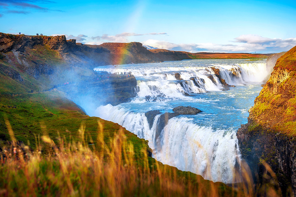 La puissante rivière glaciaire Hvítá s'y précipite en deux paliers, chutant de 32 mètres dans un étroit canyon, et vous offrant un spectacle naturel grandiose.