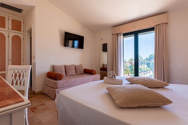• Chambre famille (36 m²) : mêmes équipements avec terrasse ou balcon vue jardin. Capacité maximum : 4 adultes (lit d'appoint ou canapé-lit).