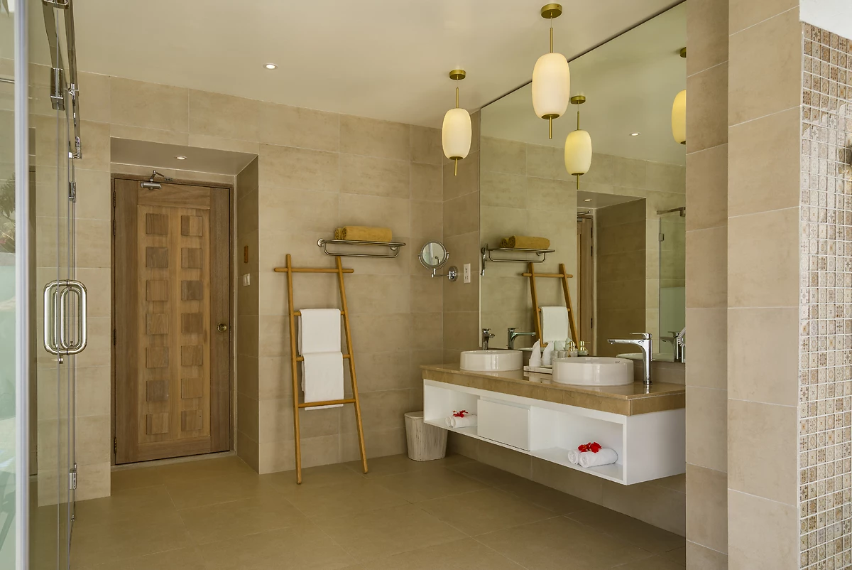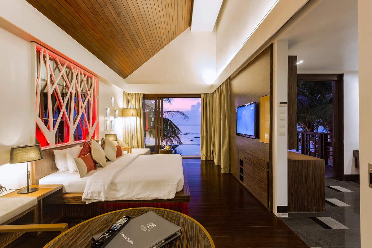 • Villa plage premium : Situées face à la mer, offrant une vue tropicale de rêve sur les palmiers et l'océan Indien, les villas de 110 m² accueillent jusqu'à 3 adultes ou 2 adultes et 2 enfants sur deux niveaux. Avec leurs prestations luxueuses, elles sont la promesse d'un séjour aux petits oignons. Le rez-de-chaussée propose une terrasse, un vaste salon, une salle de bains équipée d'une cabine de douche et de doubles vasques qui s'ouvre sur une belle cour intérieure intimiste et privative au milieu de laquelle trône un bain à remous îlot et une douche extérieure. À l'étage, une chambre à coucher avec un lit king-size, un balcon aux lignes incurvées accessible par de grandes portes-fenêtres coulissantes pour profiter au mieux de la vue et un deuxième espace WC.