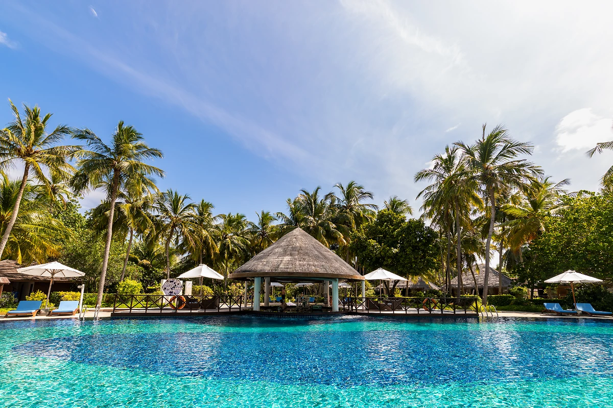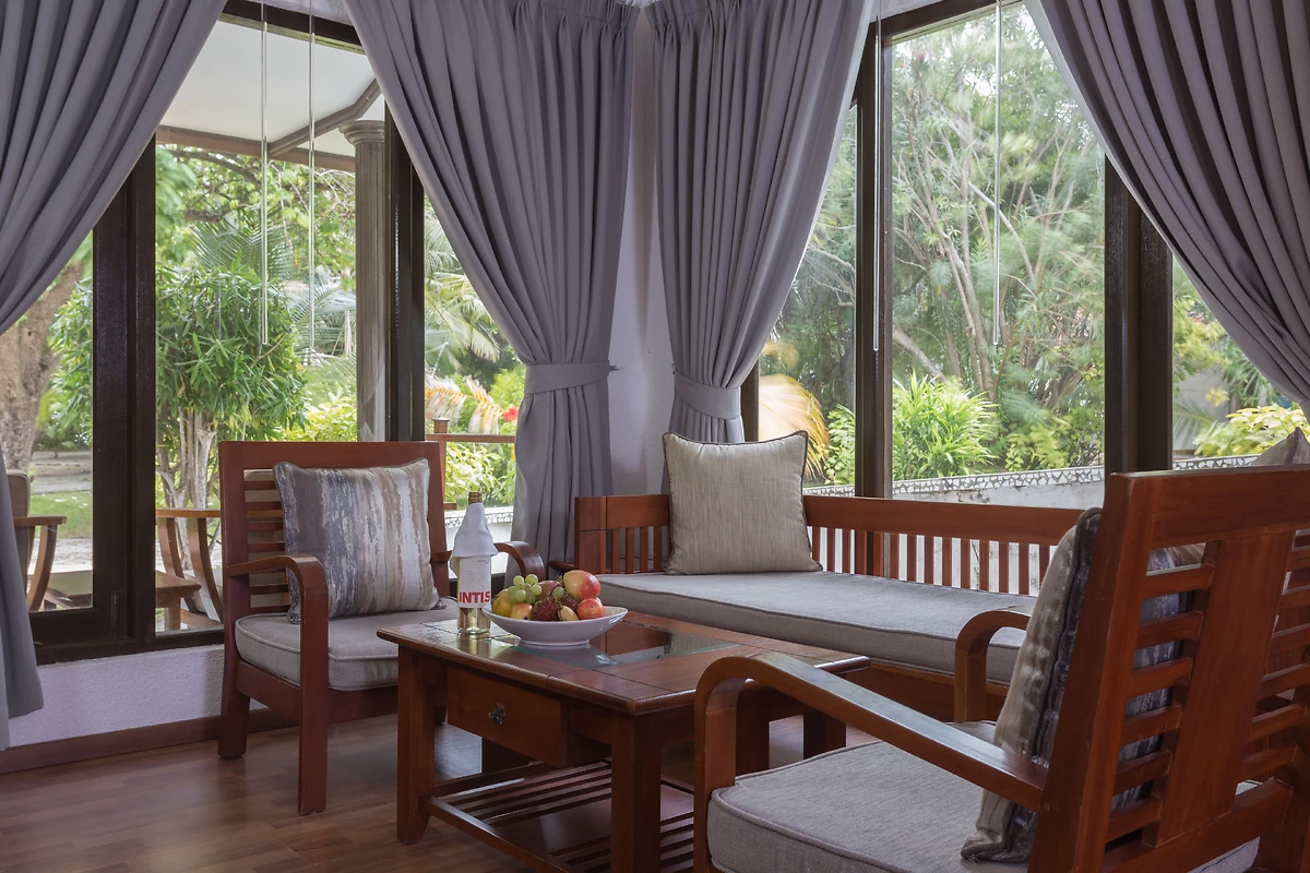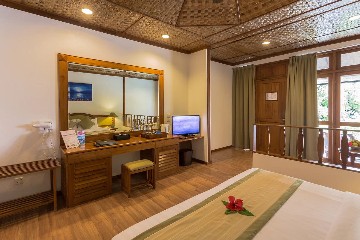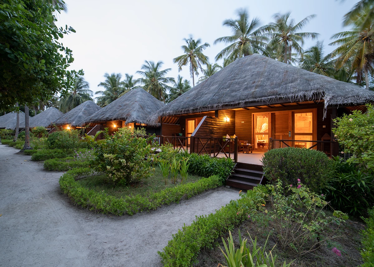 • Villa jardin : Les villas cosy de 37 m² peuvent accueillir jusqu'à 3 personnes. Elles sont situées à l'intérieur de l'île, à proximité d'une piscine et du club sportif Clubhouse. Construites dans le style traditionnel maldivien, ces chalets sont entièrement conçus en bois à l'extérieur comme à l'intérieur, avec une toiture mansardée en chaume et une belle hauteur sous plafond qui leur confère un aspect très chaleureux. La terrasse extérieure combine intimité et vue sur le jardin soigneusement entretenu de l'hôtel. Elles comprennent un lit king-size à baldaquin, une salle d'eau un coin boudoir/bureau ainsi qu'un confortable espace de détente.