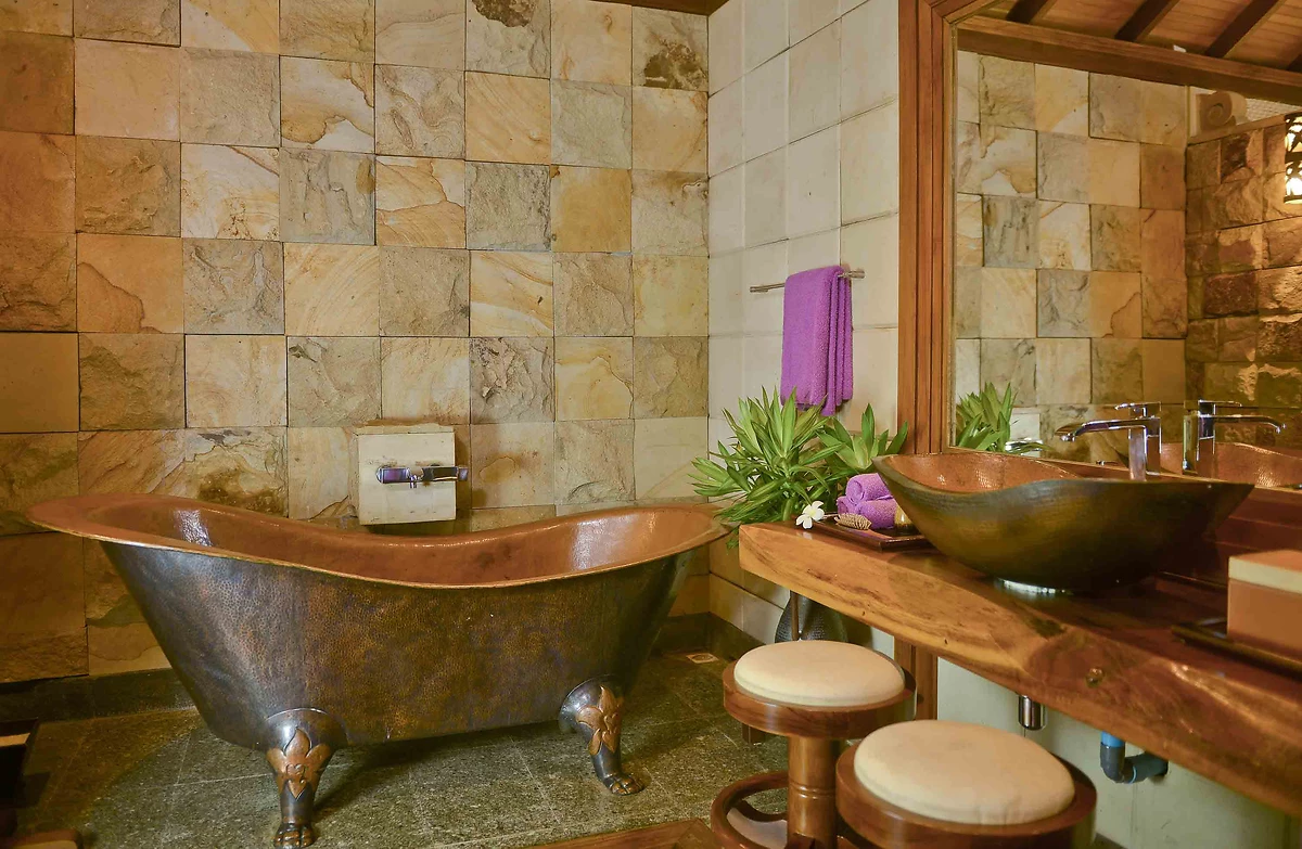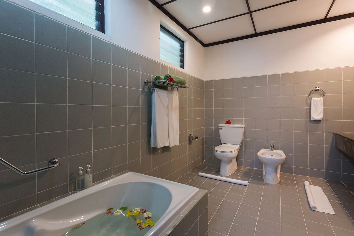 • Villa supérieure : Ces villas de 40 m², au décor épuré et moderne, sont conçues pour accueillir jusqu'à 3 personnes. Avec leurs murs blanchis à la chaux, leurs tonalités apaisantes et leur mobilier aux lignes contemporaines, elles possèdent un style à part. Elles proposent un lit king-size, un espace terrasse à l'entrée et un coin détente avec un canapé. La salle de bain est conçue autour d'une baignoire îlot et agrémenté de faïences. Bien à l'abri des regards mais une salle de bain stylée comprenant une baignoire îlot, elle est partiellement ouverte sur une douche extérieure incurvée aux murs tapissés de mosaïque. Une cabine de douche classique intérieure est également disponible.