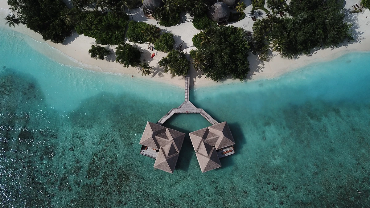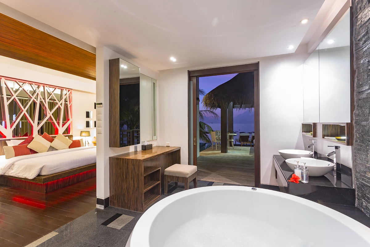 • Villa sur pilotis orientée vers le coucher du soleil : Villas romantiques de 83 m² pouvant accueillir 3 adultes, spécialement conçues pour savourer aux premières loges chaque jour les couchers de soleil exceptionnels de l'île. Construites sur pilotis, elles offrent un accès direct au lagon, une piscine à débordement, un hamac suspendu au-dessus de la mer et un espace de bronzage équipé de deux lits de plage en bois exotique. Les suites comprennent un grand lit face à une baie vitrée panoramique, une salle de bains avec une grande baignoire îlot donnant également sur la mer, une cabine de douche et une double vasque. L'ambiance y est épurée et contemporaine avec ses parquets en bois clair, ses murs blancs et plafonds mansardés agrémentés d'un élégant ventilateur au plafond ou de touches d'or brossé à l'image de la robinetterie et des appliques murales de la salle de bains.