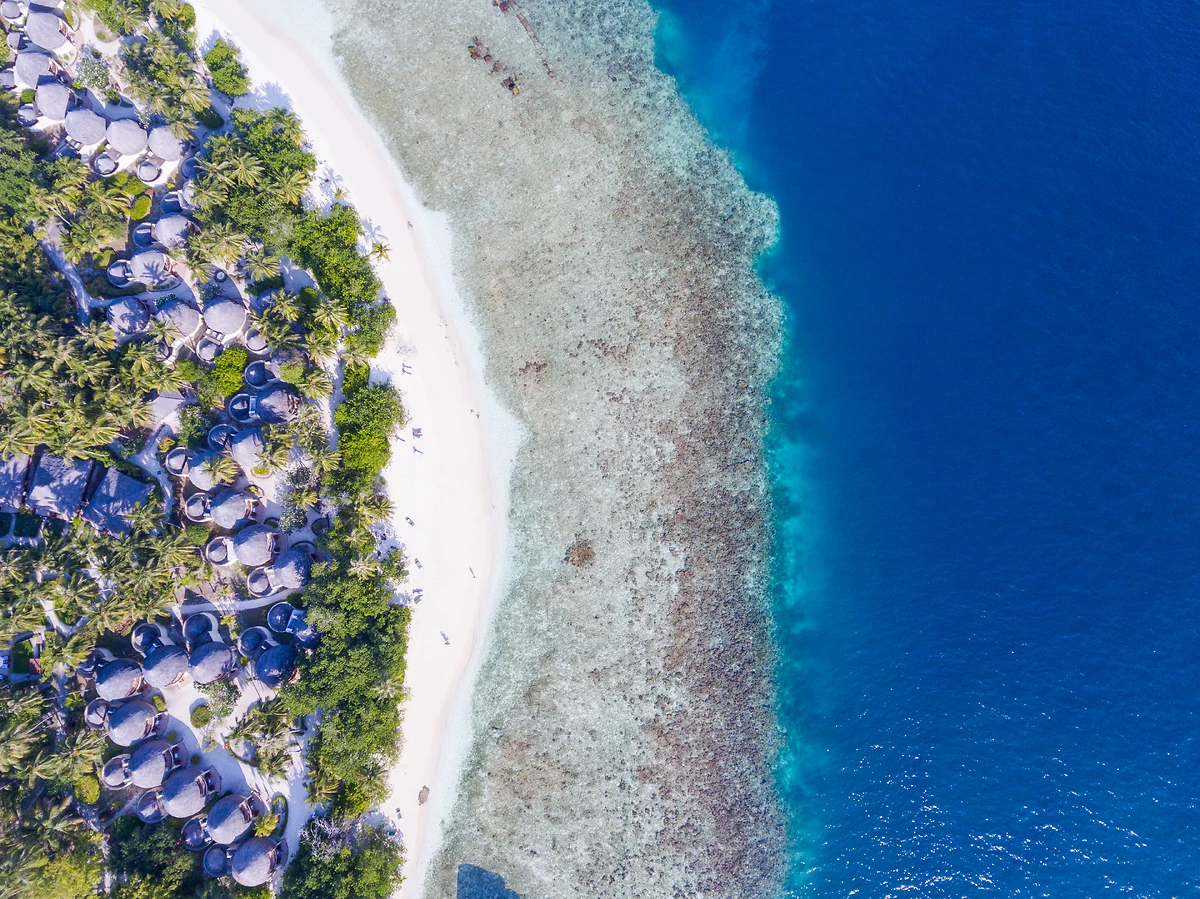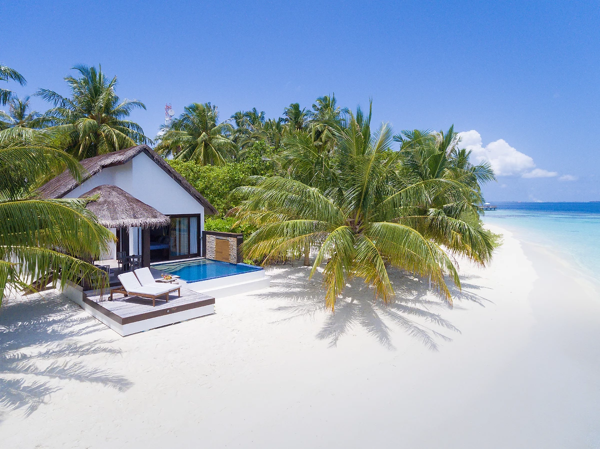• Villa plage : Les villas de 40 m² sont édifiées dans un style traditionnel maldivien à l'extérieur, avec une toiture en chaume. À l'intérieur, elles arborent un design épuré, des murs et tissus aux tonalités apaisantes et un mobilier en bois clair aux lignes contemporaines. Elles proposent une capacité d'accueil jusqu'à 3 personnes. Bénéficiant d'un accès direct à la plage, ces villas disposent d'une terrasse accueillante avec chaises, coussins et tables. La vaste salle de bains comprend une baignoire îlot et un meuble vasque. Côté chambre, un espace détente agrémenté d'un canapé propice à la lecture ou à la sieste.