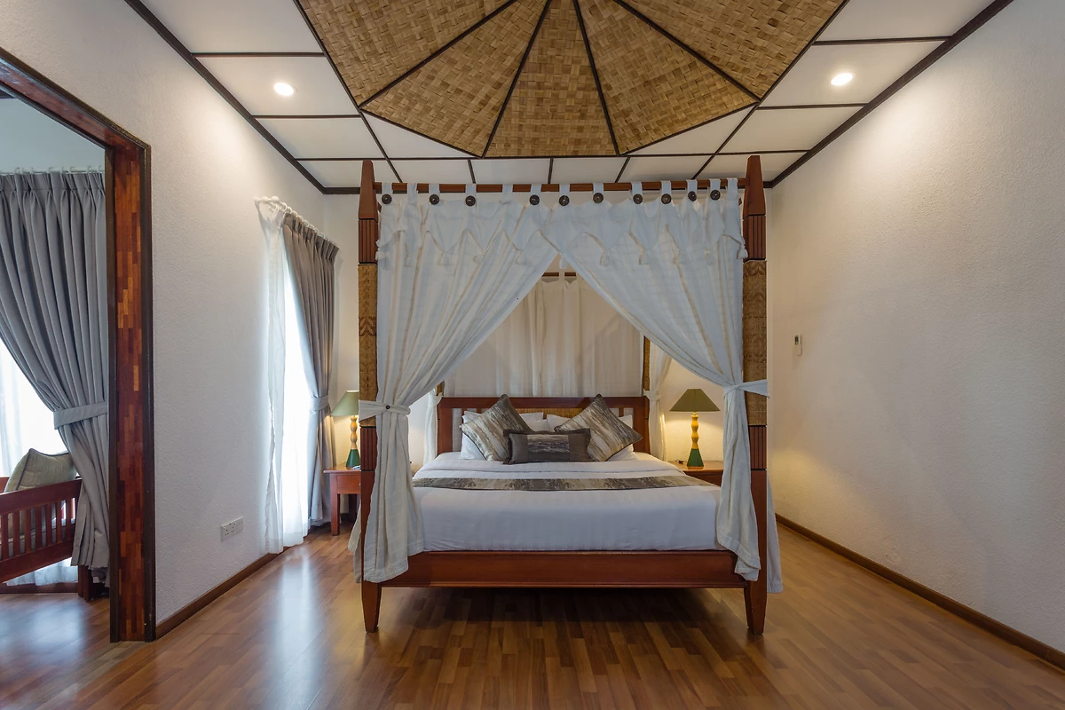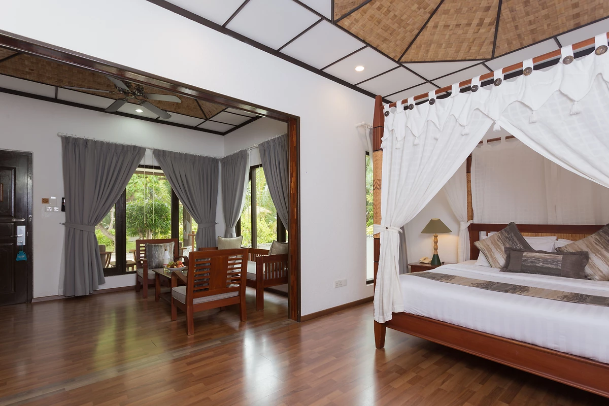 • Chambre deluxe : Ces unités de 54 m² qui font face à la mer sont agencées pour accueillir confortablement 3 adultes ou 2 adultes et 2 enfants. Elles se répartissent en pavillons comprenant deux chambres indépendantes interconnectables, offrant ainsi une expérience idéale pour un séjour familial. Les espaces généreux des pavillons se distinguent par une belle hauteur sous plafond mansardé de chaume et un sol en parquet. On y trouvera un lit à baldaquin en chambre, une salle de bain équipée de baignoire, un salon fonctionnel, un espace boudoir/bureau et une terrasse avec table et chaises.