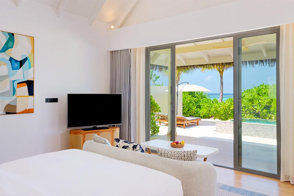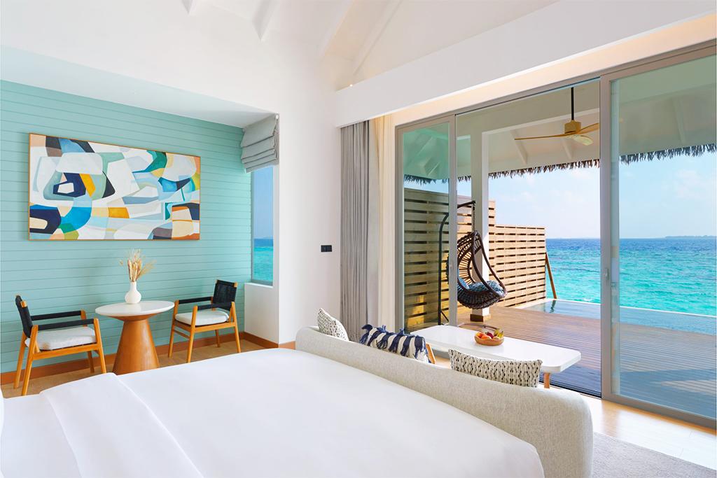 L'Overwater Pool Villa dispose des mêmes équipements que la Beach Villa avec piscine privée, terrasse avec hamac et accès direct au lagon, salon et chambre séparés