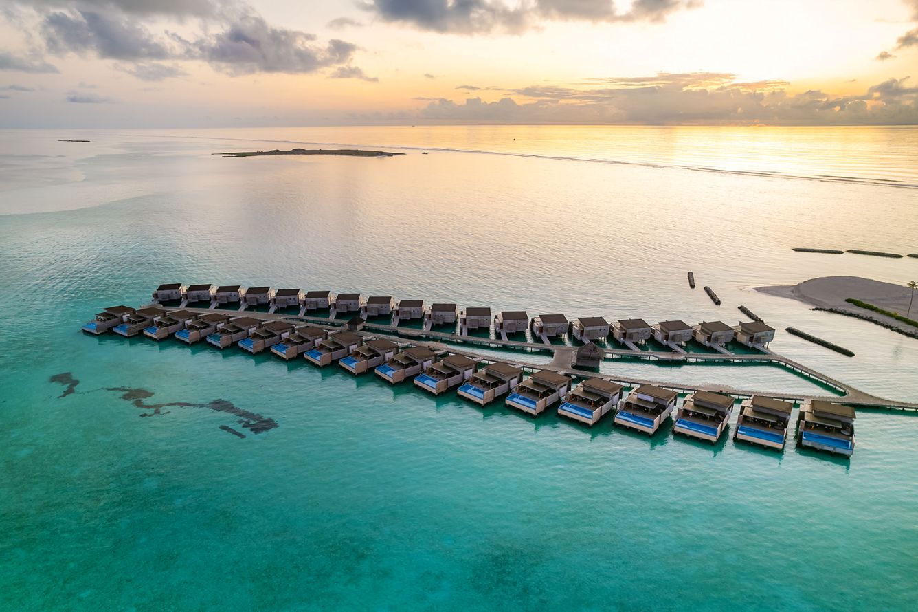 • Sunrise Water Villa with Private Pool (182 m²) sur pilotis, offrant un accès direct au lagon turquoise et une vue sur le lever du soleil