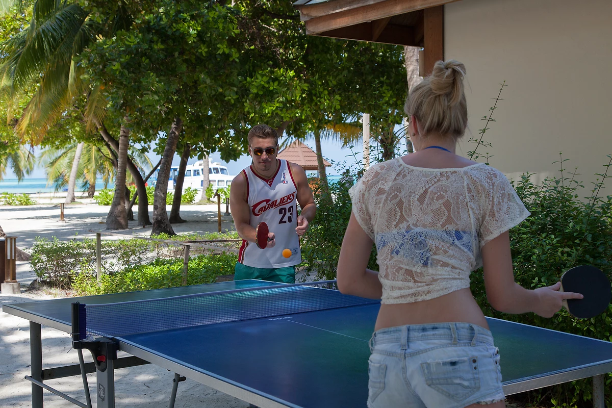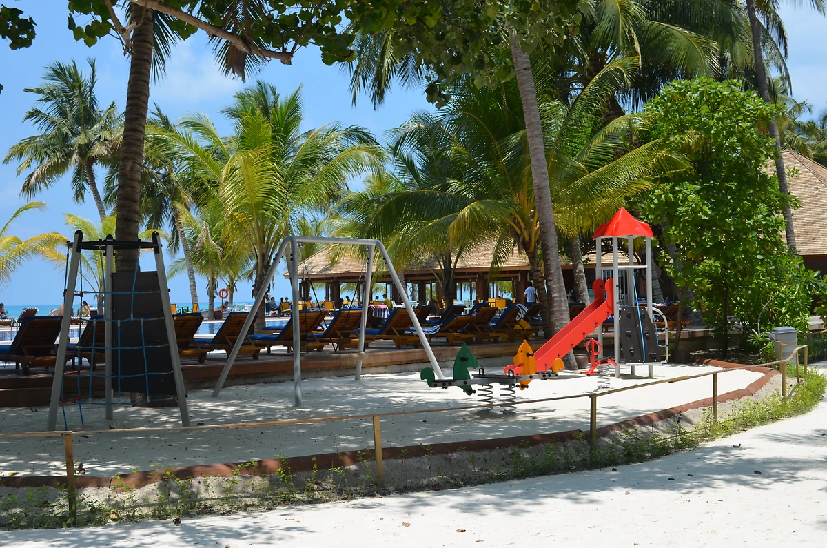• Chambre jardin : Ces chambres mitoyennes de 50 m² et de confort simple (norme Kuoni ***) peuvent accueillir 2 adultes et 2 enfants. Nichées au cœur de la végétation tropicale de l'île dans un bâtiment de 20 unités en forme de U, elles offrent un cadre paisible tout en étant à proximité des infrastructures de l'hôtel (Dhoni Bar) et de ses plages. Elles affichent un style épuré et de beaux volumes. Chaque unité comprend une chambre ouverte sur une terrasse, équipée d'un lit king-size surmonté d'un ventilateur de plafond, d'un bureau/boudoir, d'une méridienne et d'un dressing. La salle d'eau est pourvue d'une cabine de douche classique, d'une vasque et d'un WC. Elle s'étend à l'extérieur avec un espace partiellement ombragé et aménagé, doté de deux lits de plage.