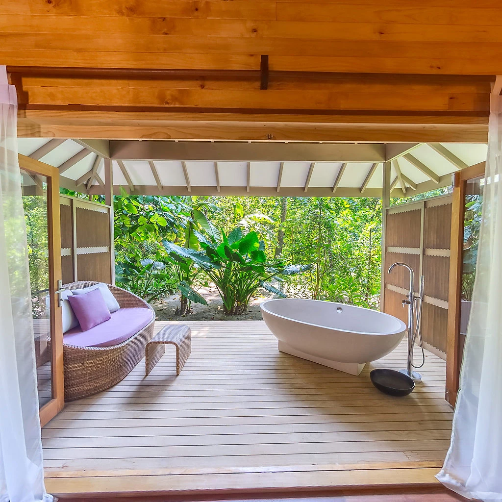 • Villa front de mer : Ces résidences de 60 m², réservées exclusivement aux adultes, sont conçues pour accueillir jusqu'à 3 personnes. Avec de beaux volumes sous plafonds mansardés, chaque chambre comprend un lit-king size surmonté d'un ventilateur de plafond, un espace bureau, un coin salon avec canapé et table basse, ainsi qu'un espace dressing. Offrant une vue paradisiaque depuis leur terrasse aménagée en première ligne face à l'océan Indien, ces résidences assurent une intimité totale grâce à des palissades et une verdure bordant le passage. La terrasse est équipée de lits de plage et d'un parasol, invitant à contempler les eaux céruléennes du lagon pour une détente exotique ultime. La salle de bains semi-ouverte à l'arrière est équipée d'une double vasque, d'une douche et de WC, s'ouvrant sur une arrière-cour avec un bain à remous en plein air à l'abri des regards.