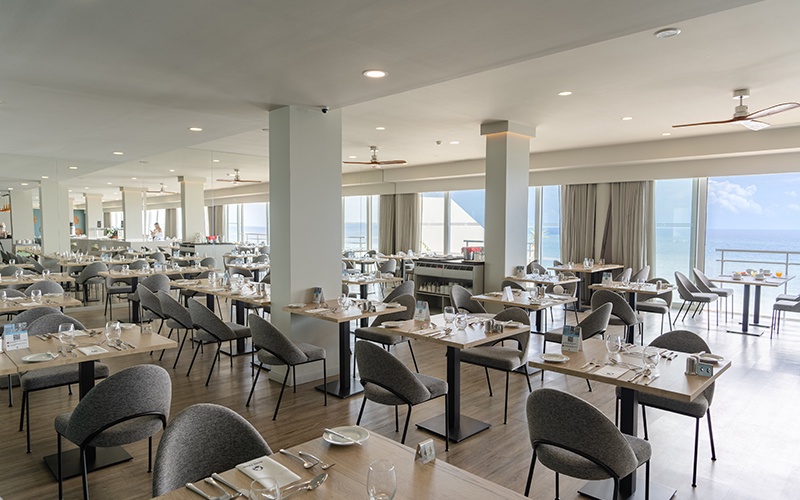 Restaurant principal Panoramico avec vue panoramique sur l'océan, proposant petit-déjeuner buffet et dîner en supplément (méditerranéen, portugais et international, parfois menus à la carte).