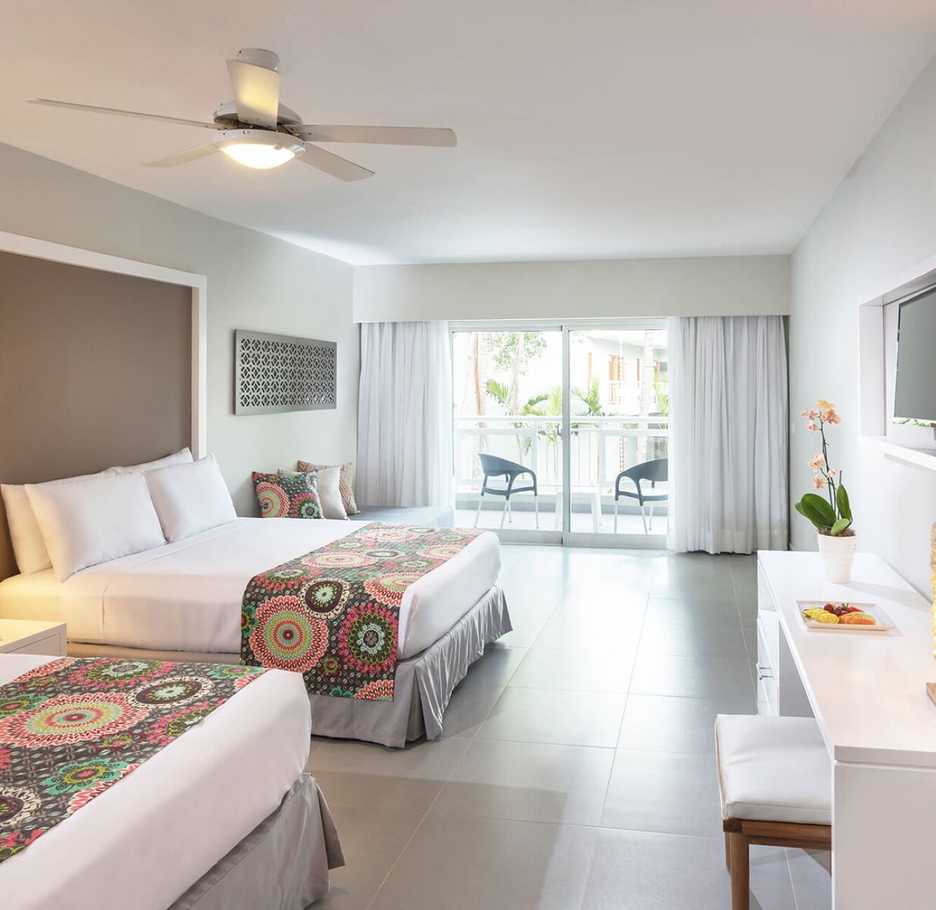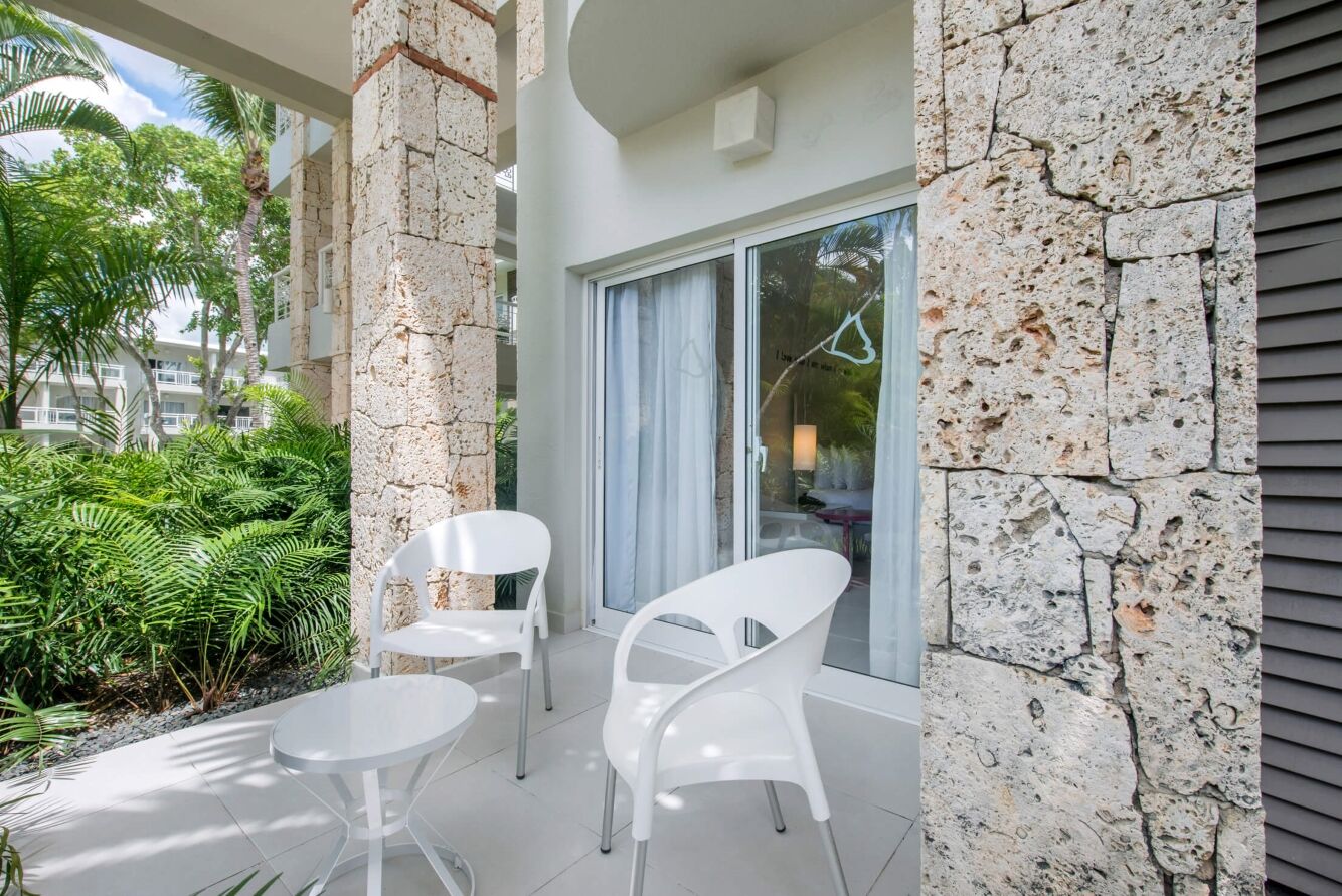 409 chambres réparties dans des petits bâtiments, elles sont toutes équipées de climatisation, télévision, minibar réapprovisionné quotidiennement, nécessaire thé et café, coffre-fort, salle de bain avec douche, sèche-cheveux, fer et table à repasser, balcon ou terrasse.