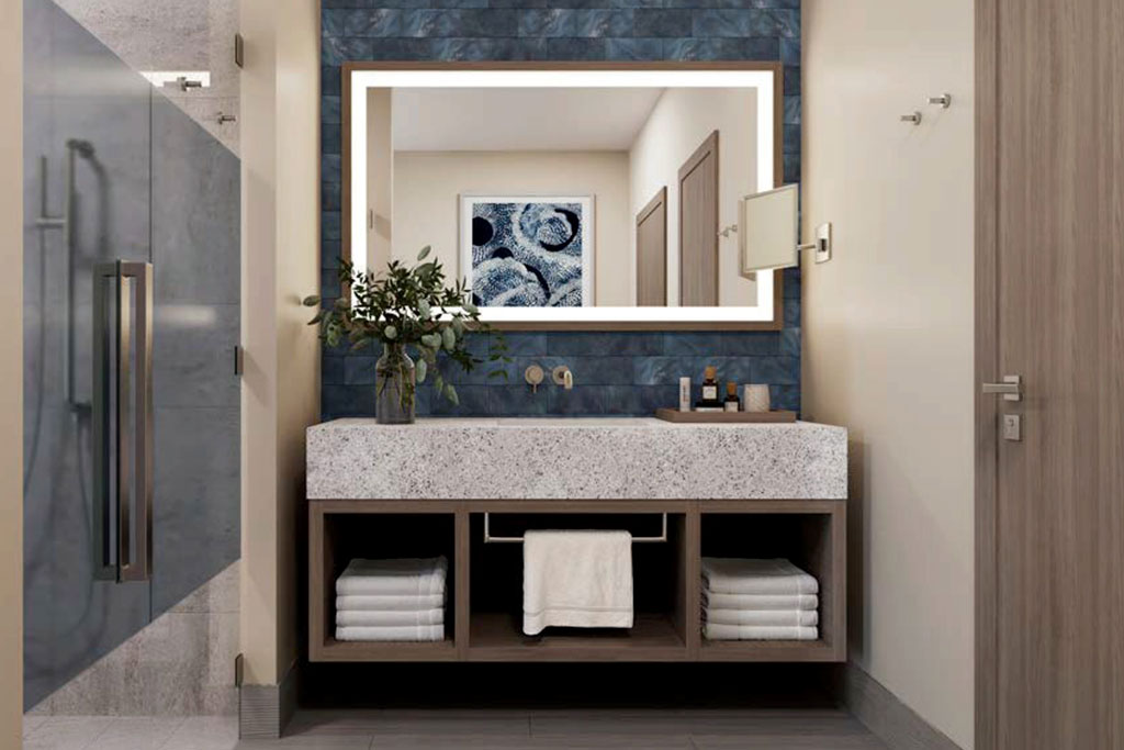 Salle de bains avec douche à effet de pluie et sèche-cheveux