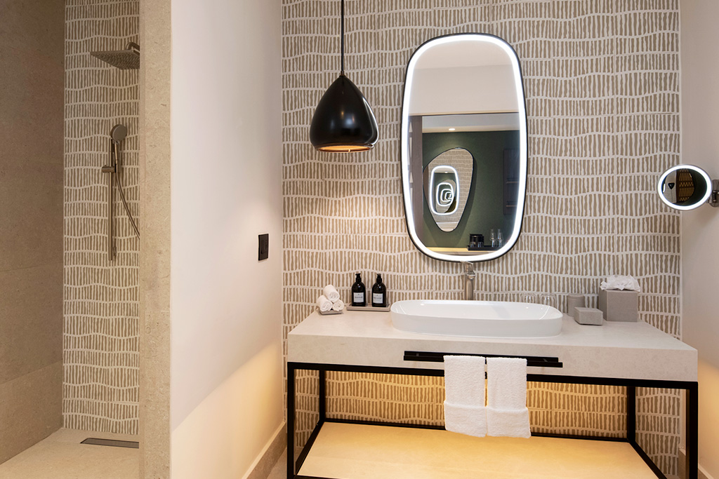 Salle de bains avec douche à l'italienne et sèche-cheveux