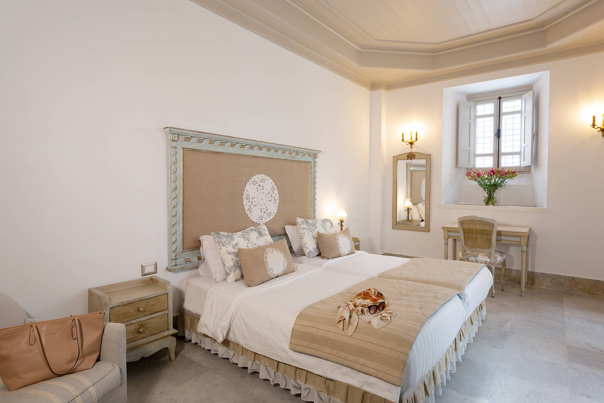 La Suite Prestige représente l'expérience la plus exclusive de Dar Saïd. Offrant une vue imprenable sur la Méditerranée, elle révèle un décor enchanteur où l'horizon azur devient un tableau vivant. Elle est dotée d'un grand lit double, d'une salle de bain avec baignoire et sèche-cheveux, ainsi que d'un ensemble complet d'équipements modernes : climatisation, Wi-Fi, télévision, téléphone, mini-bar, coffre-fort et nécessaire à thé/café.