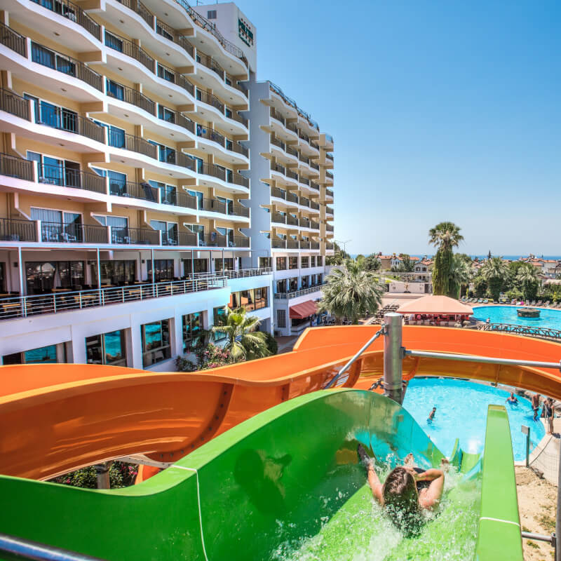Le Palmin Hotel 4*, construit en 2002 et rénové en 2025, est un hôtel à taille humaine possédant 156 chambres. Des navettes gratuites pour la plage, située à 800m, sont disponibles de 9h30 à 18h30. À votre disposition, différentes piscines, dont une piscine couverte avec sauna et bain à remous, des animations de jours et des spectacles le soir. Un mini-club est également prévu pour que vos enfants passent un séjour inoubliable. À votre disposition : Réception 24h/24, room service*, boutiques*, coiffeur*, photographe*, location de voitures* (sur demande), blanchisserie*, médecin*, parking, téléphone/fax, serviettes de plage, chaises longues et parasols, navette pour la plage, wifi gratuit.